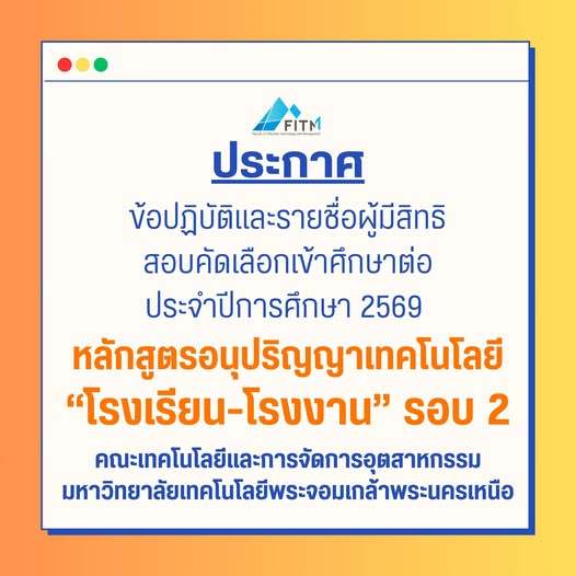 ข้อปฏิบัติและรายชื่อผู้มีสิทธิสอบคัดเลือกเข้าศึกษาต่อหลักสูตรอนุปริญญาเทคโนโลยี โครงการรับสมัครคัดเลือกเข้าศึกษา “หลักสูตรโรงเรียน-โรงงาน” ประจำปีการศึกษา 2569 รอบ 2