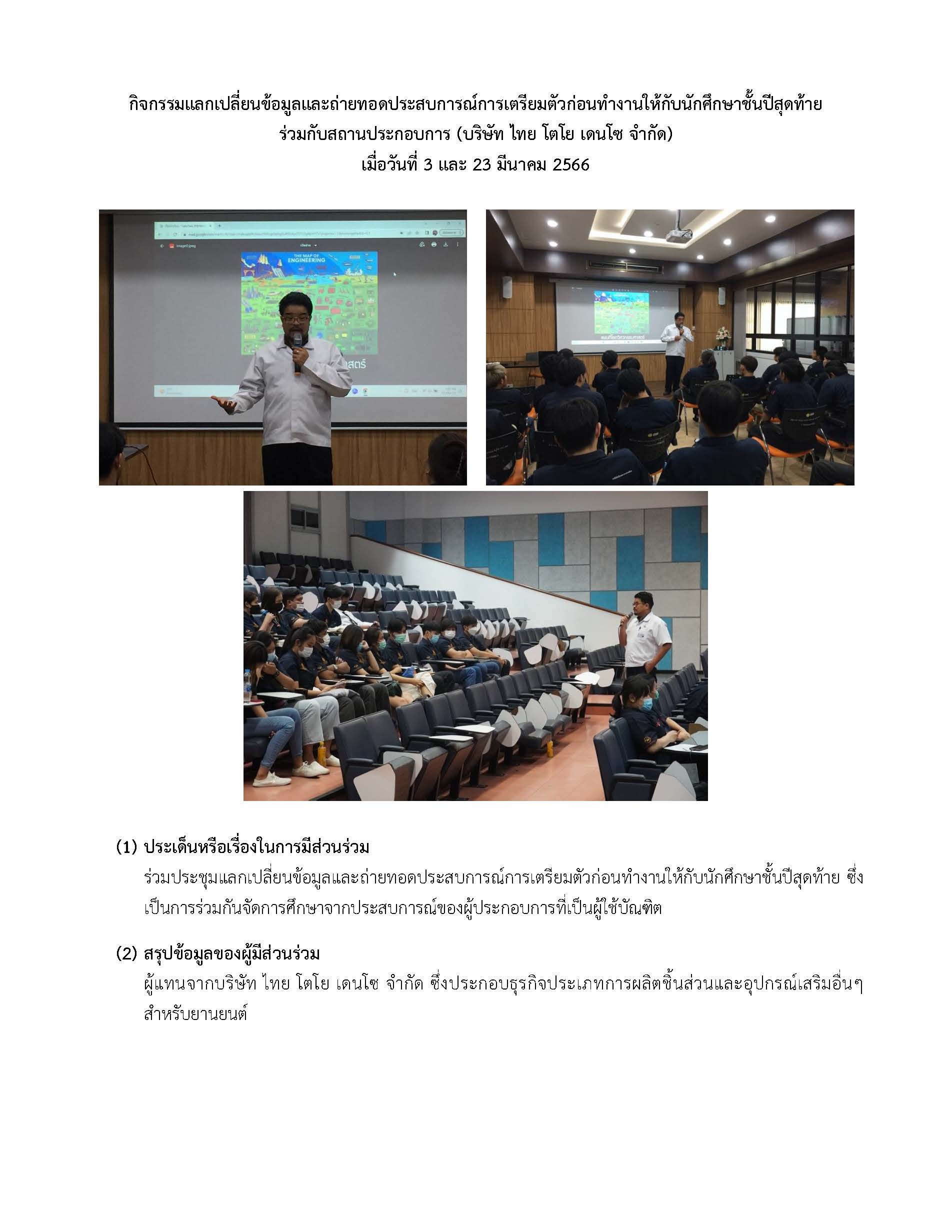 กิจกรรมแลกเปลี่ยนและถ่ายทอดประสบการณ์การเตรียมตัวก่อนทำงานให้นักศึกษาชั้นปีสุดท้ายร่วมกับสถานประกอบการ(บริษัท ไทย โตโย เดนโซ จำกัด)เมื่อวันที่ 3 และ 23 มีนาคม 2566