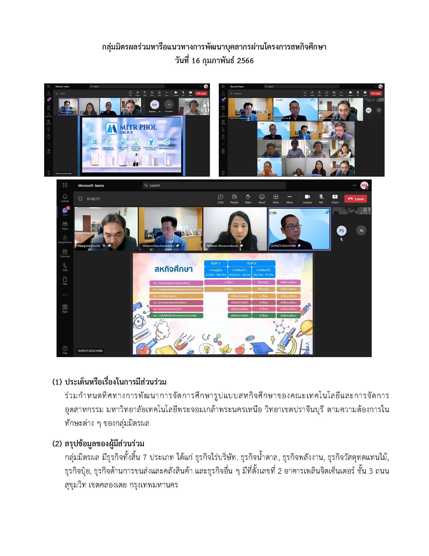 มีการแลกเปลี่ยนข้อมูลและความต้องการของสถานประกอบการกลุ่มมิตรผล เพื่อนำมาวางแผนการจัดการศึกษาร่วมกับคณะเทคโนโลยีและการจัดการอุตสาหกรรม มหาวิทยาลัยเทคโนโลยีพระจอมเกล้าพระนครเหนือ วิทยาเขตปราจีนบุรี ในรูปแบบสหกิจศึกษาในภาคการศึกษาถัดไป